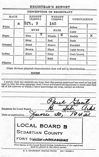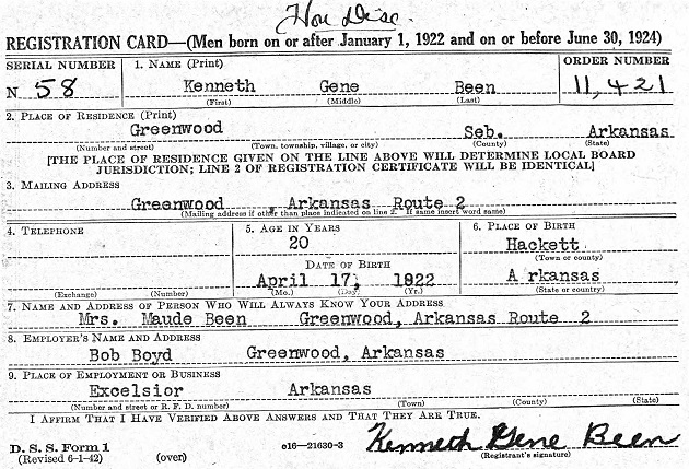 Kenneth registered for the military draft June 30, 1942 in Sebastian Co., Ar. He
