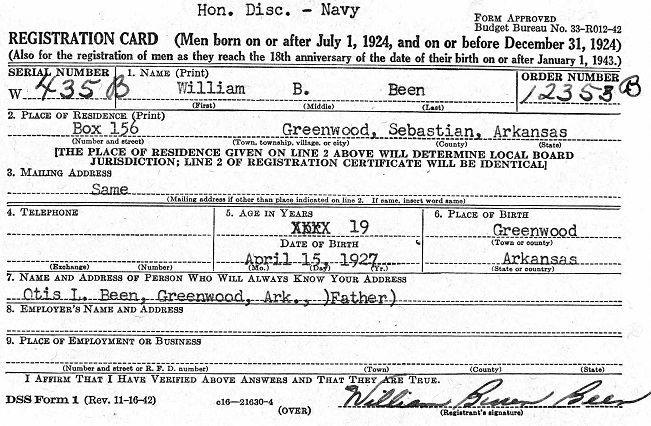 William Buren Been was born April 15, 1927 in Greenwood, Sebastian Co., Arkansas to