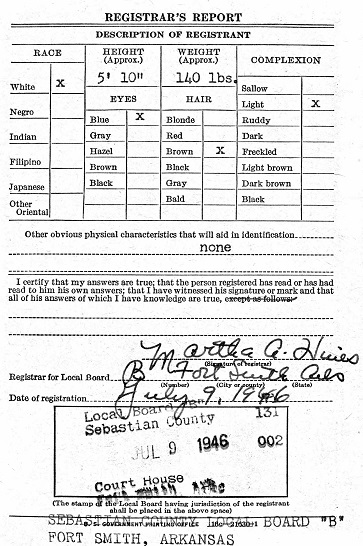 July 9, 1946 William registered for the militry draft at the Sebastian Co., Court house in
