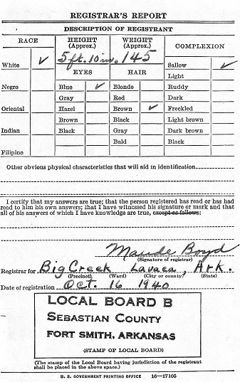 regristered for the military draft on Oct. 16, 1940 at Lavaca, Sebastian Co., Ar.