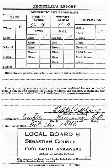 October 16, 1940 Hairl registered for the military draft at Greenwood, Sebastian Co.,