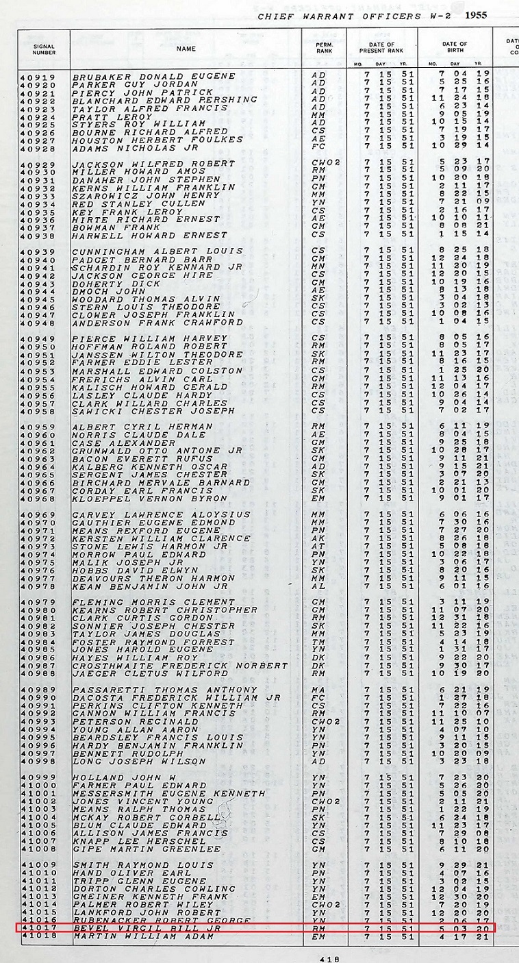 Warrant Officer Virgil Bill Bevel Jr., USN was an exceptional officer