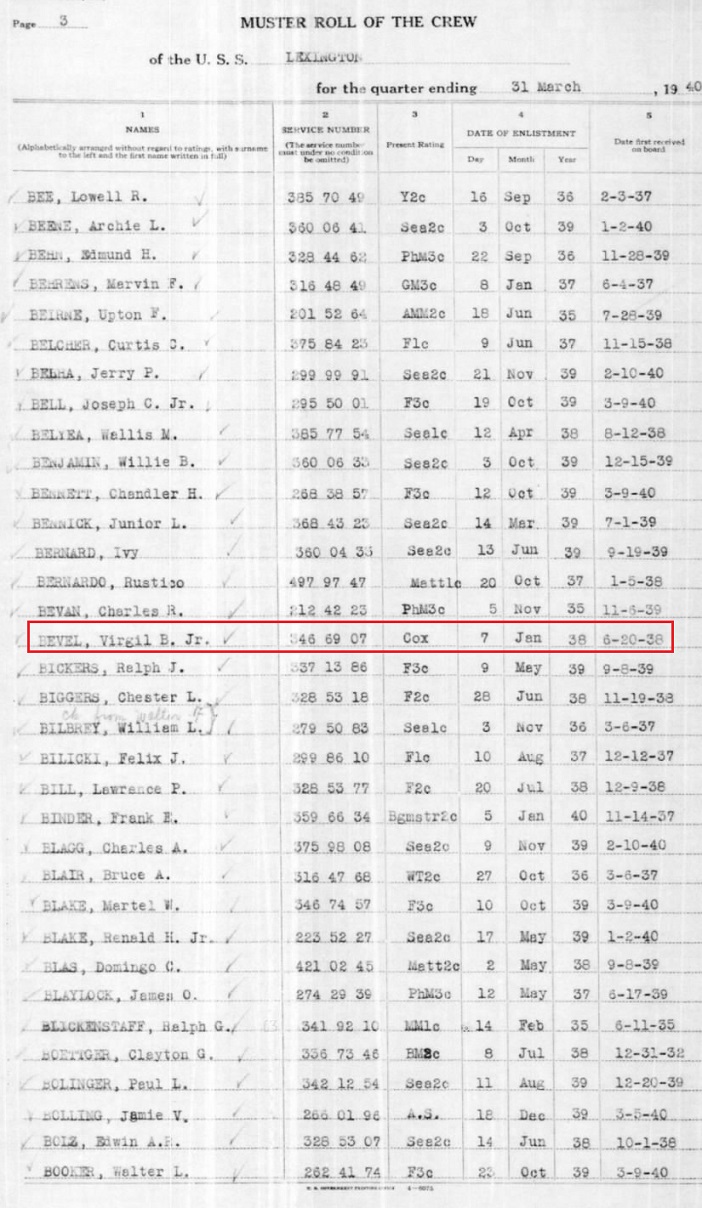 He served aboard the USS Lexington until June 13, 1940.