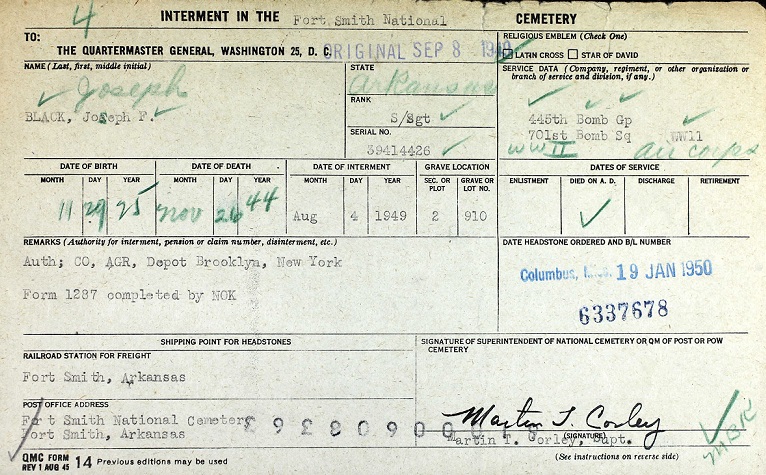 S Sgt Black was attached to the 445th Bomb Gp, 701st Bomb Sq.