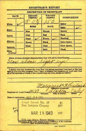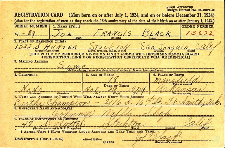 Joe registered for the military draft at San Joaquin Co., California on December 29, 1942.