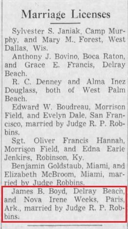 James married Nova Irene Weeks in Palm beach, Florida.