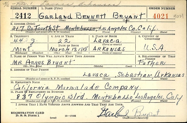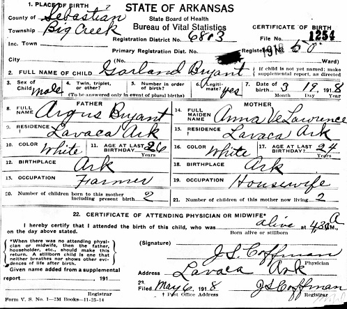 Garland Bennett Bryant was born March 19, 1918 in Big Creek Twsp., Sebastian Co., Ar. to