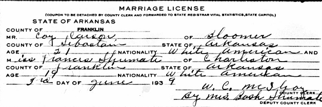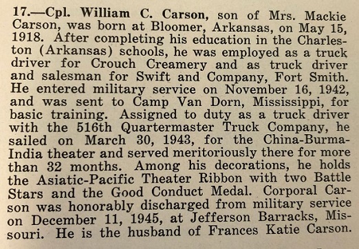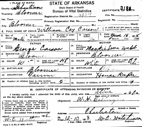 William Coy Carson was born May 15, 1918 at Bloomer, Sebastian Co., Ar. to