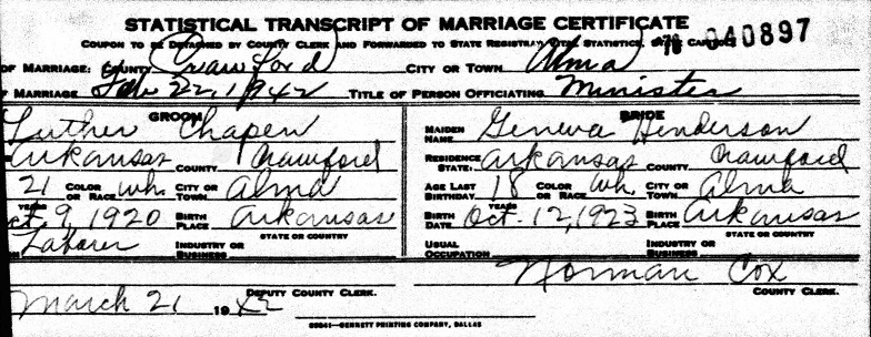 Geneva Henderson in Crawford Co., Ar. They both were residents of Alma, Crawford Co, at that time.
