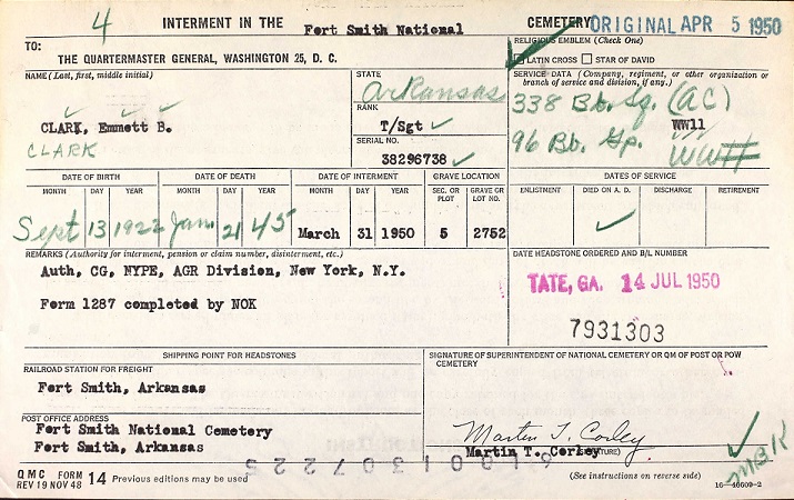 TSgt Emmett B Clark is buried at Fort Smith National Cemetery, Fort Smith, Sebastian Co., Ar