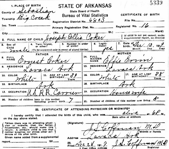Joseph Ellis Coker was born Decemter 13, 1919 in