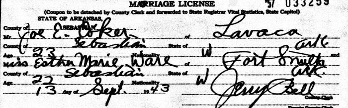 September 14, 1943 Joe married Esther Marie Ware of Fort, Smith, Sebastian co., Ar.