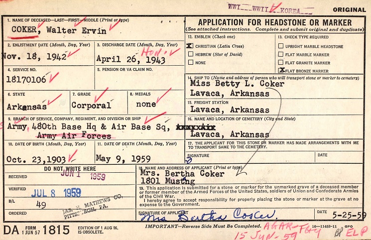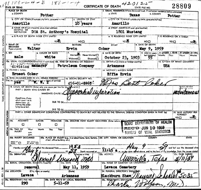 Walter Ervin Coker passed away May 9, 1959 at Amarillo, Porter, Texas. His