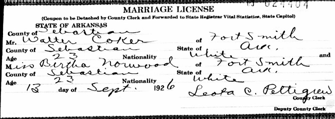 Bertha Norwood at Fort Smith, Sebastian Co., Ar. where they both resided at