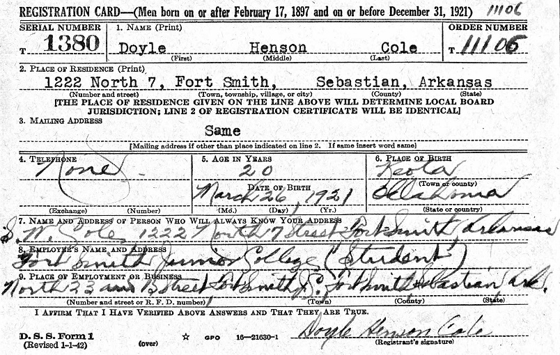 Doyle Henson Cole was born March 26, 1921 in Keota, Okla. to