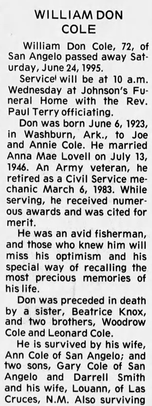 William Donald Cole was born June 11, 1923 to Joseph "Joe" C. &