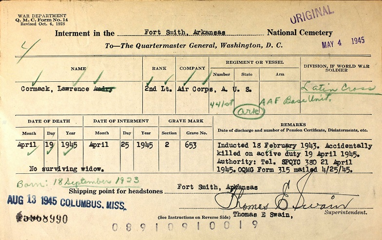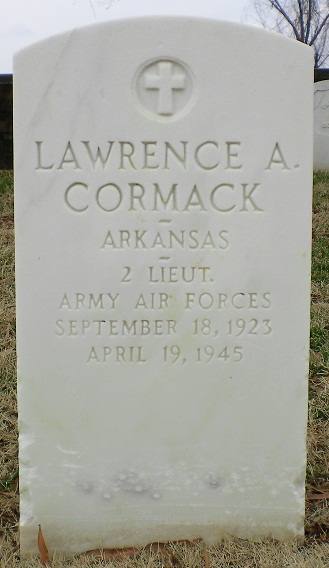 2Lt Lawrence Audrey Cormack was born in Eagle Twsp Sebastian Co. Arkansa on 18 Sep 1923 to