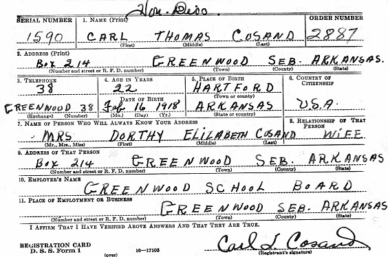 Carl Thomas Cosand was born February 16, 1918 in Hartfod, Sebastian Co., Ar.