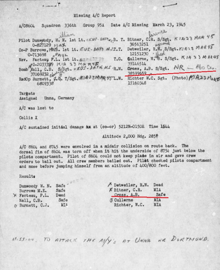 S/Sgt Cross survived. They were only 1 Mile West of Airfield, Grottaglie, Italy. All the missions