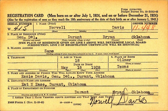 Norvell Davis was born September 28, 1928 in Gilmer, Upshur Co., Texas to