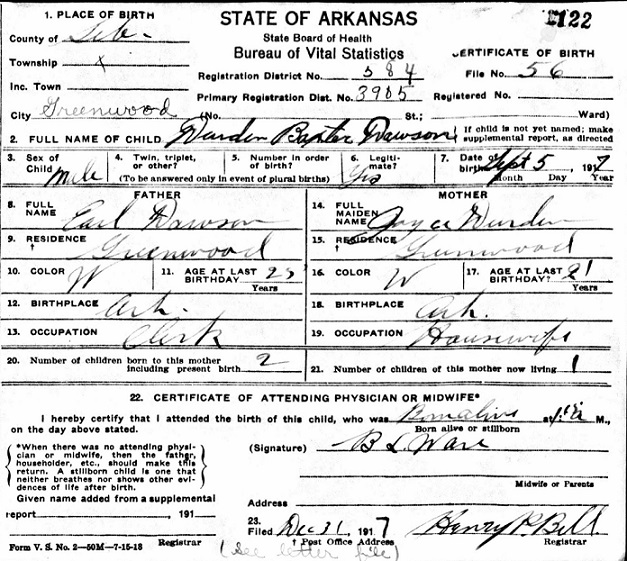 Durden Baxter Dawson was born September 5, 1917 in Greenwood, Sebastian Co., Ar. to