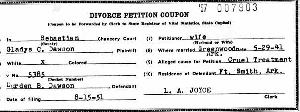 from the war Durden and Gladys were granted a divorce at Greenwood, Ar.