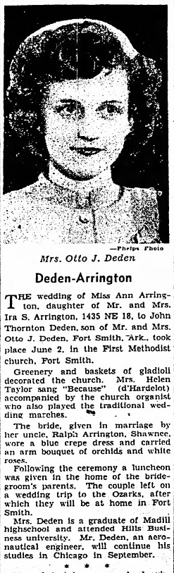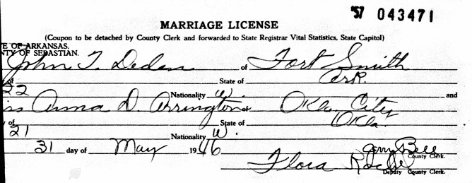 Anna D Arrington, of Oklahoma City, Oklahoma, the wedding being in Fort Smith, Sebastian Co., Ar.