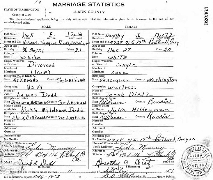 Dorothy J. Dietz in Clark, Washington state. The marriage record below says