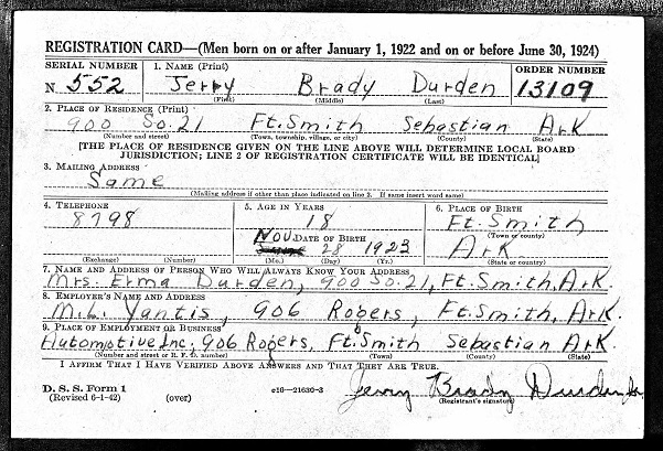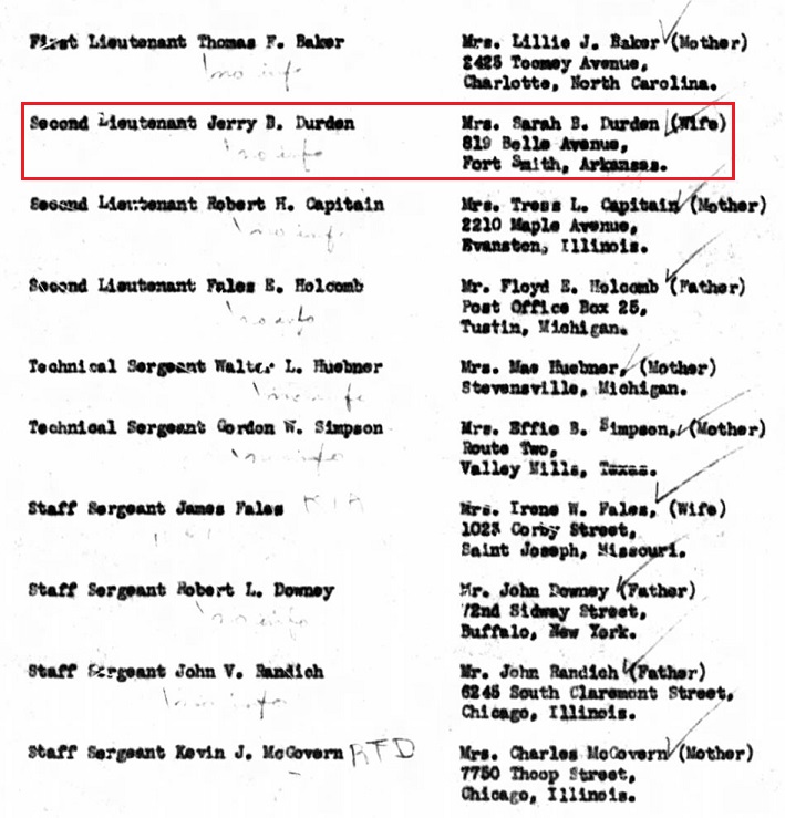 2Lt Jerry Brady Durden was born in Fort Smith, Ar on 28 Nov 1923 to Jeremiah Brady &