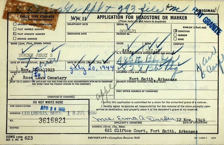 2Lt Jerry Brady Durden is buried in Rose Lawn Park Cemetery in Fort Smith, Ar.