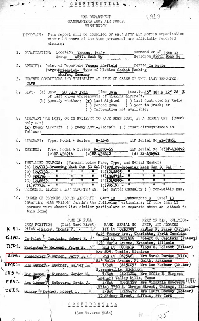 2Lt Durden was assigned to the 485th Bu Gp 828 Bu Sq A/S Air Corps.