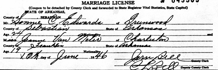 from Charleston, Franklin Co., Ar. whom he married June 11, 1946 in Sebastian Coumty, Ar.