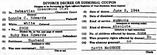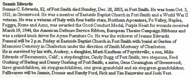Sonnie Clay Edwards passed away December 28, 2003 in Fort Smith, Sebastian Co., Ar.
