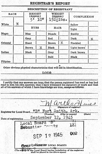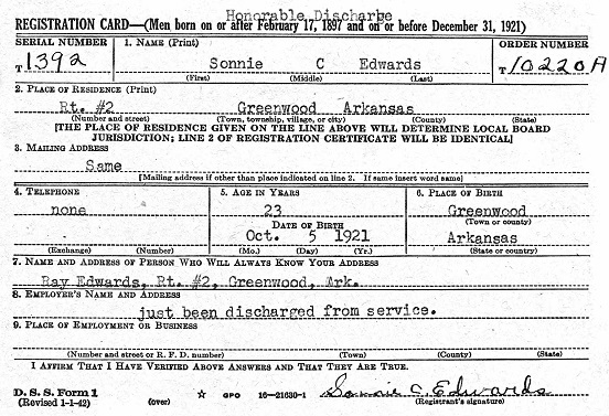 September 12, 1945 Sonnie registered for the military draft. His draft card states that he