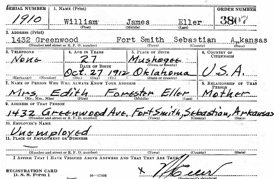 William James Eller was born 27 Oct 1912 in Muskogee, Oklahoma to