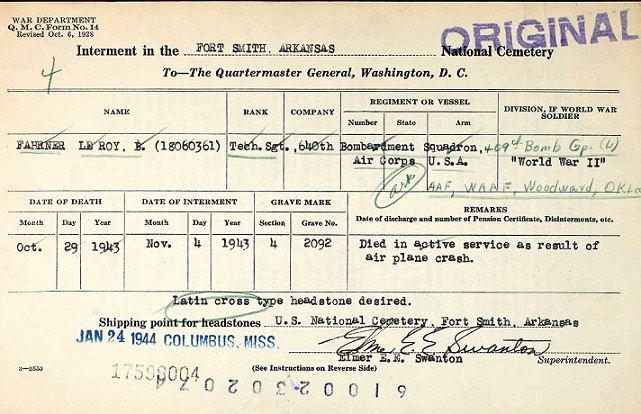TSGT LeRoy Benjamin Fahrner was killed in a plane crash over Woodward, Okla. while