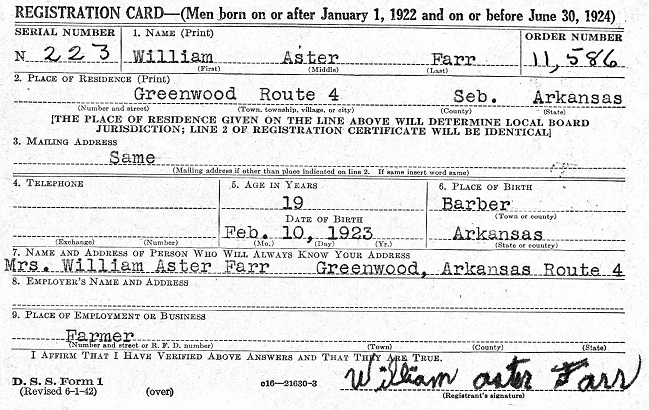 William "Bill" Aster Farr was born February 10, 1923 in Barber, Sebastian Co., Arkansas