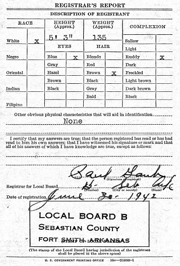 Bill registered for the military draft on June 20, 1942 in Sebastian Co. Ar.