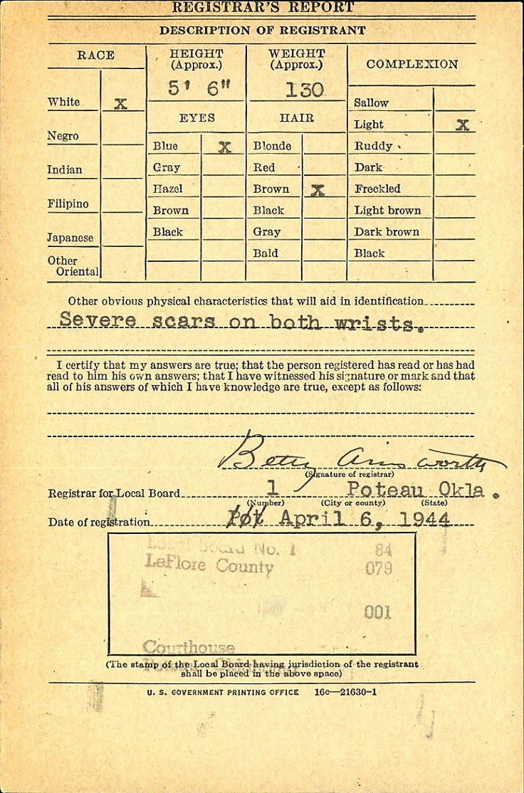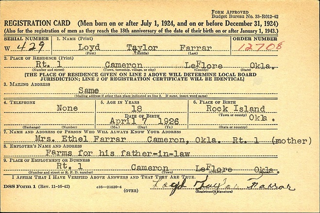 April 6, 1944 Loyd registred for the draft at LeFlore Co., Okla. No record of