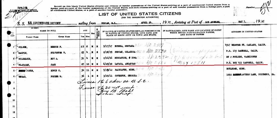 Irby Derwood "Jack" Flanagan passed away January 10, 1989 at Fort Smith, Sebastian Co., Ar.