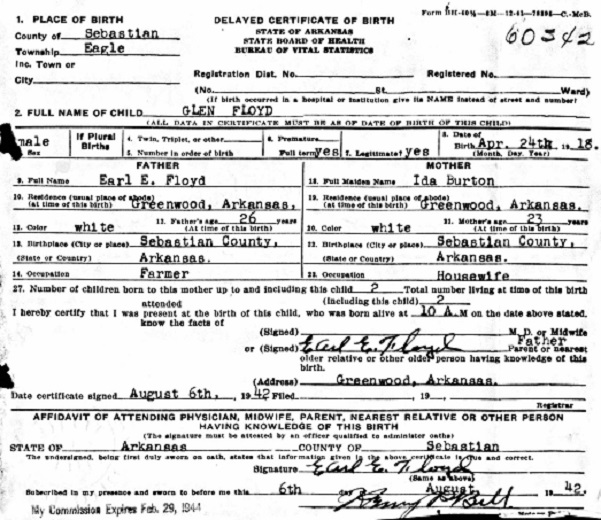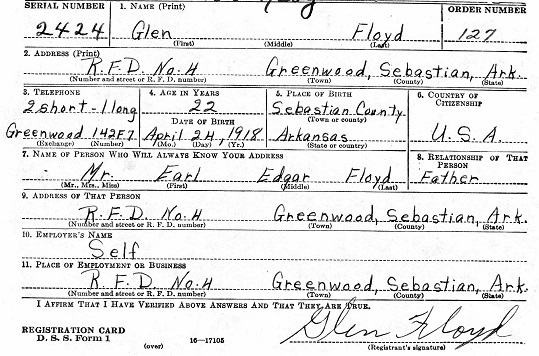 Glenn Floyd was born April 24, 1918 at Eagle Township, Sebastian Co., Ar. to