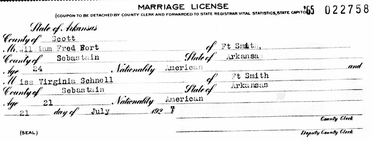 Fred married Virginia Schnell in Scott Co., Ar. although both were