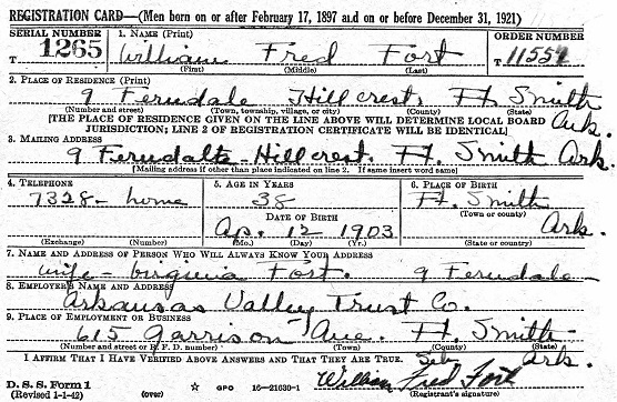 William Fredrick Fort was born April 12, 1903 in Fort Smith, Sebastian Co., Ar. to
