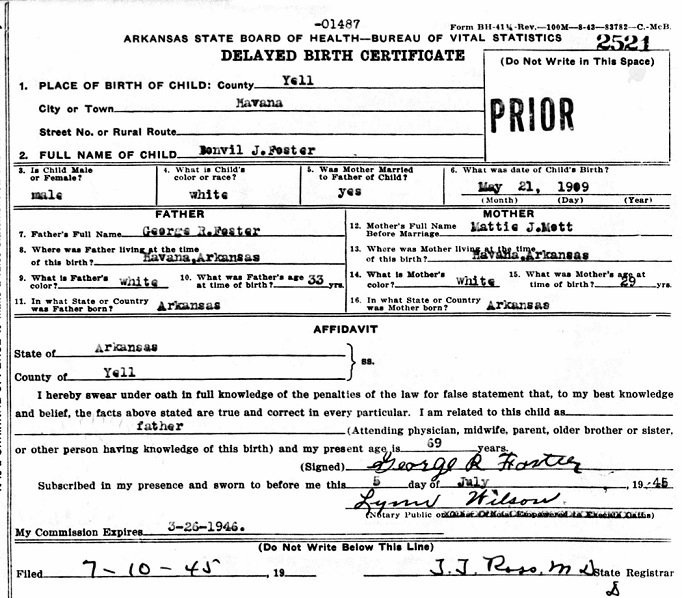 Bonvil J Foster was born May 21, 1909 in Havana, Yell Co., Ar. to
