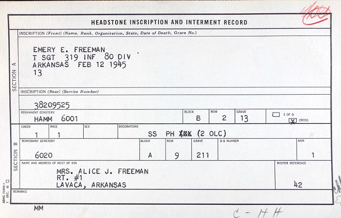 Emery Freeman's rank was Technical Sergeant with 319th Infantry 80th Division