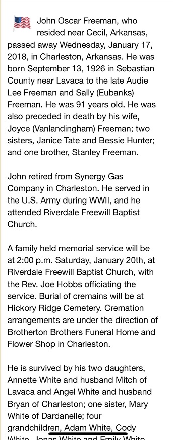 John Oscar Freeman, who resided near Cecil, Arkansas, passed away Wednesday,