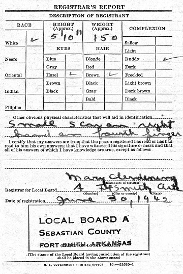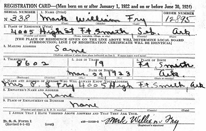 June 30, 1942 Mark registered for the military draft in Fort Smith, Sebastian Co., Ar.