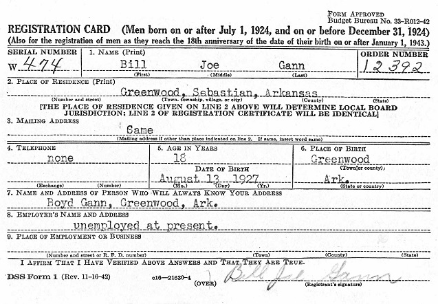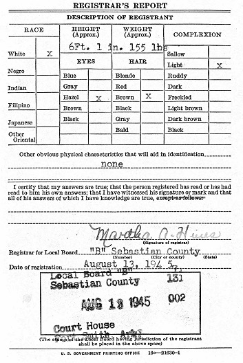 On August 13, 1945 Bill registered for the military draft at the courthouse at Fort Smuth,