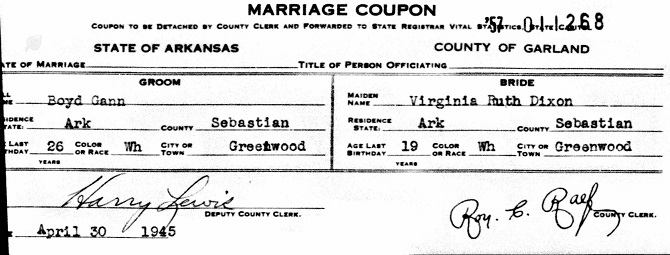 Boyd Greer Sr. & Grace A Coleman Gann. April 30, 1945 Boyd married