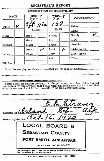 Sebastian Co., Ar. His draft registration card has "U.S. Army Okla City,